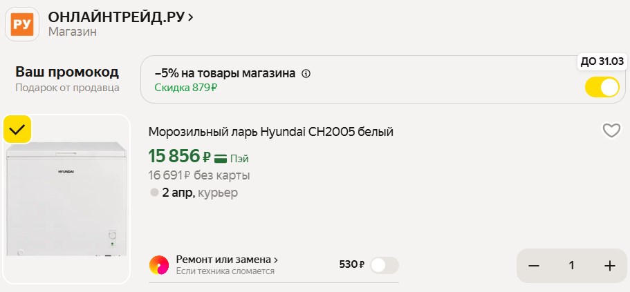 Привет. На Маркете сейчас морозильный ларь Hyundai CH2005 за 15 856₽ с промокодом 7C611B84 - обычно от 18 тысяч. Объём 198 л, замораживает до 9 кг в сутки, держит холод до 30 часов без света. Температура опускается до 24 градусов, шум в пределах 42 дБ - терпимо для дома или дачи.