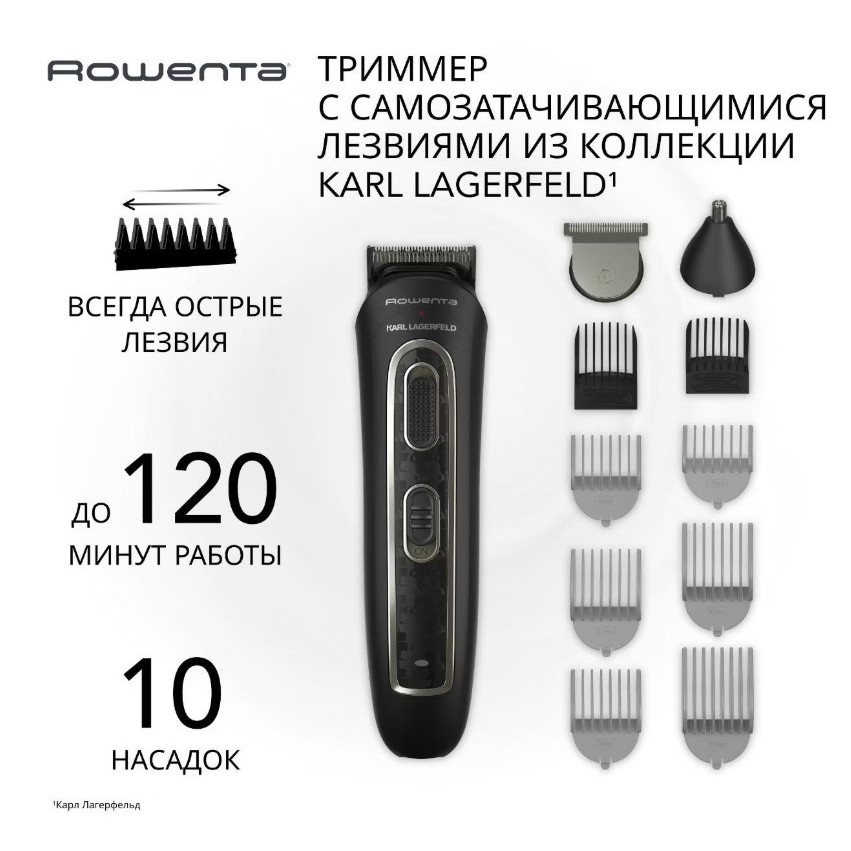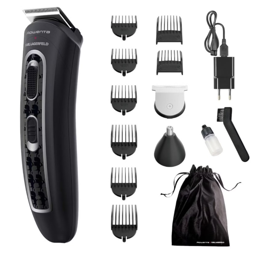 сейчас в М.Видео можно взять за 1557₽ с учётом бонусов - в других местах он обычно от 1900₽. Стильный дизайн от Karl Lagerfeld плюс нормальная начинка: лезвие 42 мм с частотой 6500 об/мин, регулировка длины от 0,5 до 32 мм. В комплекте 11 насадок, включая XL на 44 мм для волос и гребень 3-12 мм для бороды