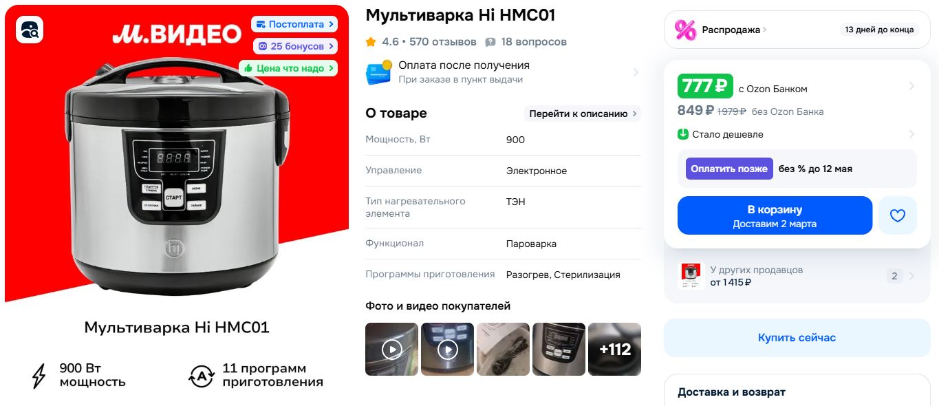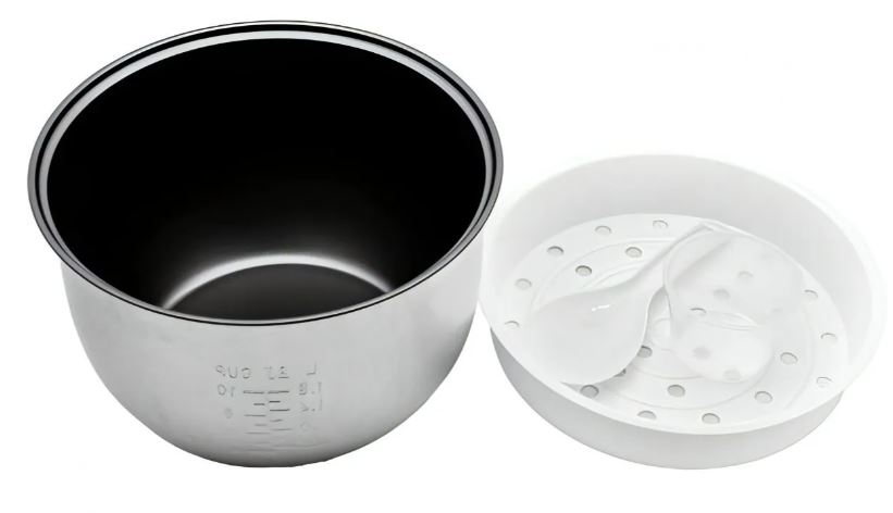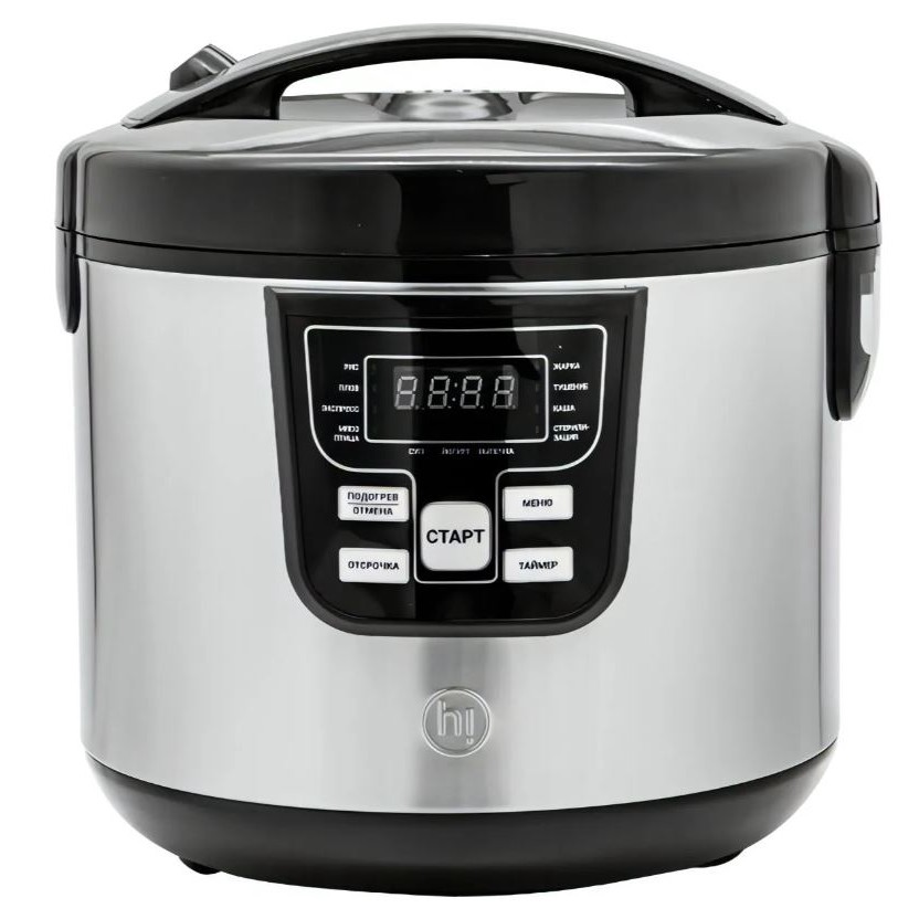 По характеристикам простенькая: мощность 900 Вт, чаша 5 литров, антипригарное покрытие, 11 автоматических программ. В комплекте ещё мерный стакан, мерная ложка и контейнер-пароварка.