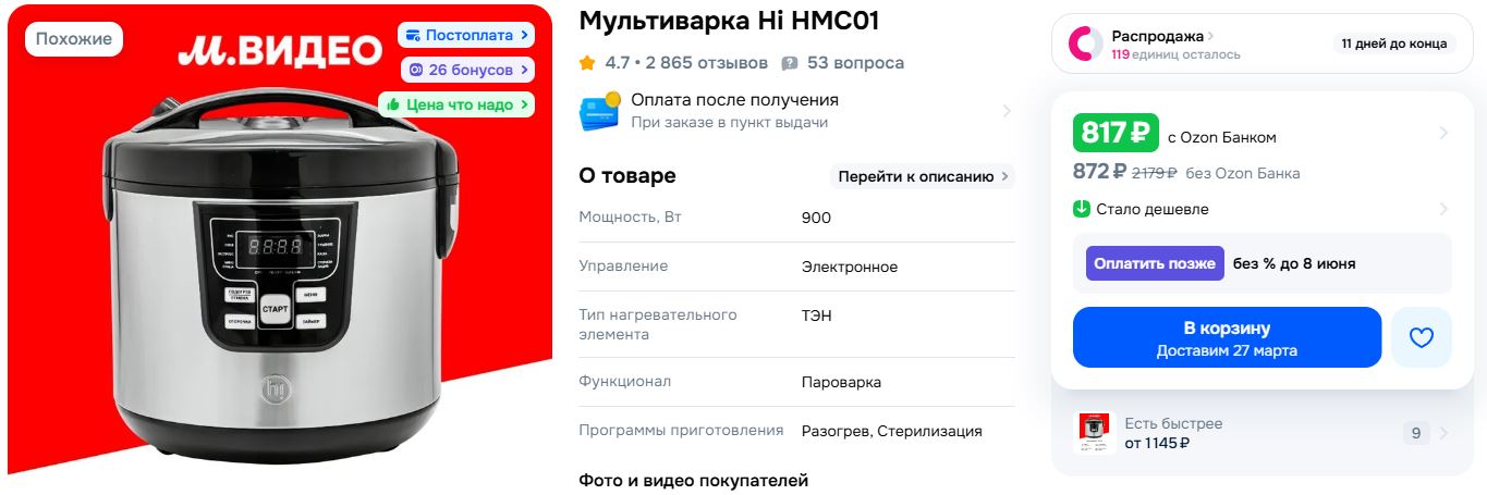 По характеристикам простенькая: мощность 900 Вт, чаша 5 литров, антипригарное покрытие, 11 автоматических программ. В комплекте ещё мерный стакан, мерная ложка и контейнер-пароварка.