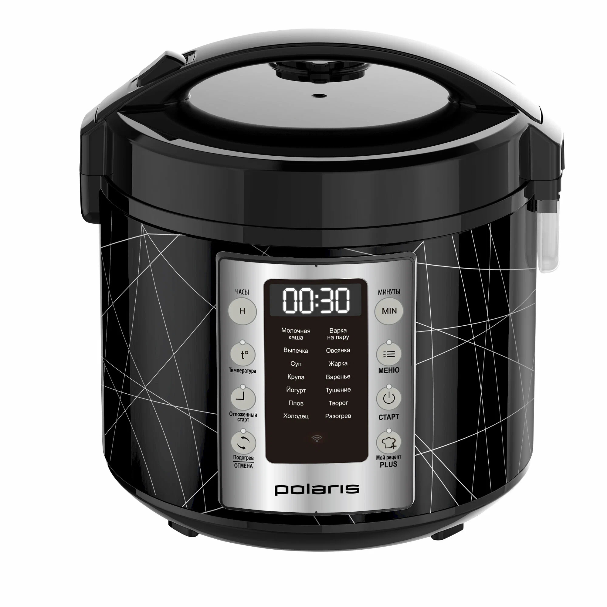 Мультиварка с поддержкой Wi-Fi и системой умного дома IQ Home, есть 45 автоматических программ приготовления, имеет чашу на 5 литров и управляется через приложение на смартфоне.