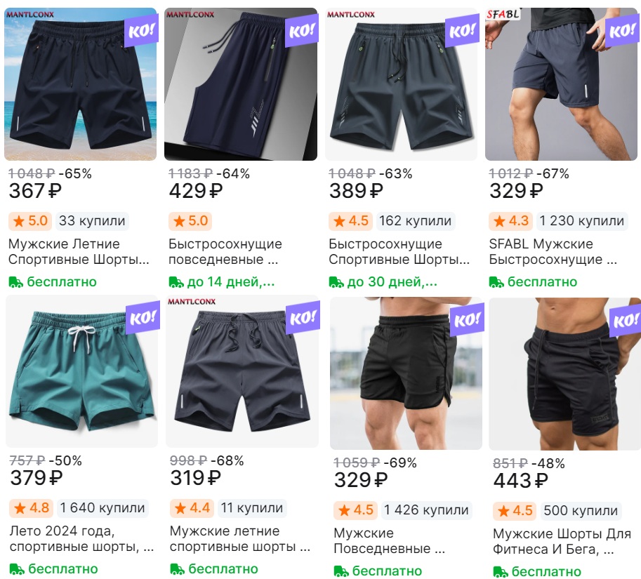 С AliExpress можно выгодно заказать шорты на лето или для спортзала. В каталоге огромный выбор моделей и расцветок. Заказ через комбо-корзину от 1000₽, но доставка ускоренная и бесплатная.