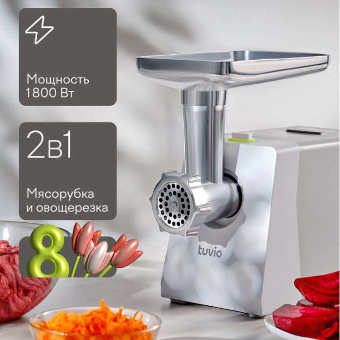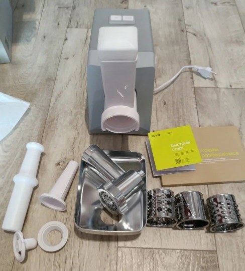 Плюс встроенная овощерезка: тёрка, шинковка, насадка для драников - всё в одном. В комплекте ещё насадки для кеббе и домашних колбасок, два диска (5 и 7 мм), реверс, металлический лоток, ножки-присоски, чтобы не прыгала по столу, и отсек для шнура, чтобы не болтался.