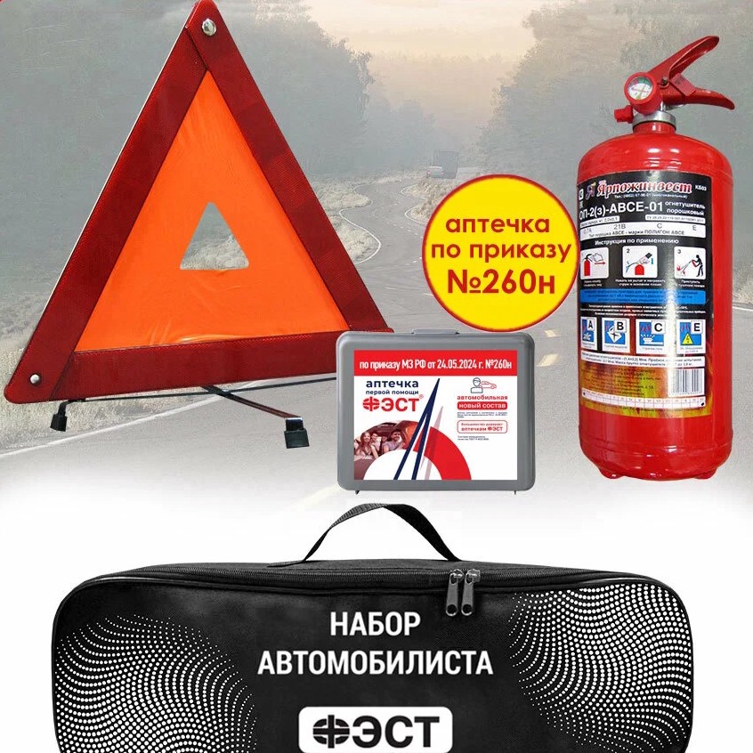Цена значительно ниже, чем в других местах. Готовый набор для техосмотра, включающий всё необходимое: аптечку нового образца ФЭСТ, огнетушитель, знак аварийной остановки и сумку для хранения.