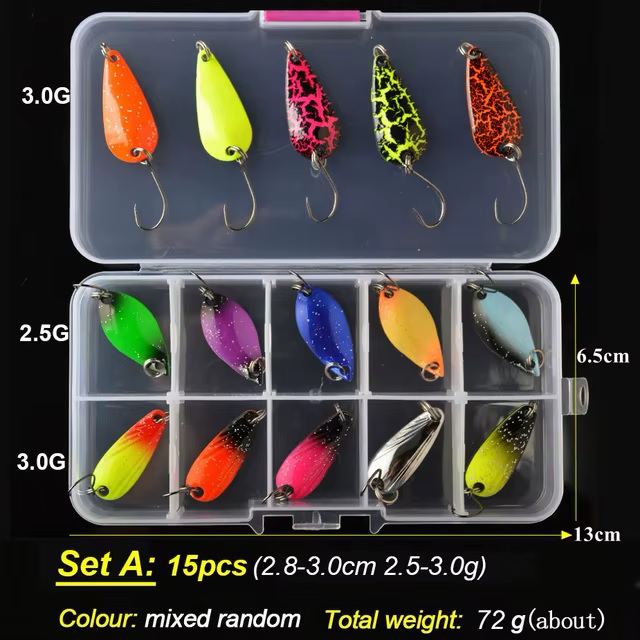 Набор от популярного бренда рыболовных приманок ToMa. Включает 15 металлических блёсен разных расцветок, предназначенных для ловли форели, а также других хищных рыб на спиннинг. Приманки лёгкие весом от 2.5 г, крючки одинарные и острые.