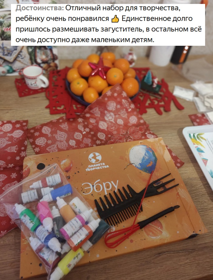 Потом рисунок переносится на бумагу. Выглядит как магия, дети будут в восторге. В наборе 75 предметов: 15 цветов красок, лоток, загуститель, кисти, шпажки, гребень, фартук, скатерть и 30 листов А4. Даже новички разберутся, как смешивать и переносить рисунок.
