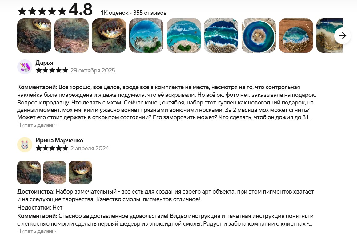 В наборе есть всё, чтобы сделать картину: смола, красители, перламутр, мох, камни, артборд, плюс стаканчики, перчатки и плёнка на стол. Докупать ничего не надо, кроме фена и весов, но у нас есть. Смола пахноватая, лучше проветривать, но в целом занятие увлекательное и результат симпатичный получается.