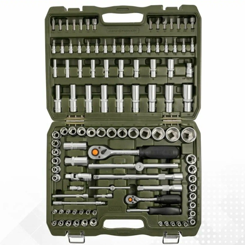 Два посадочных квадрата: 1/4" (для мелкого крепежа, салона, электроники) и 1/2" (для подвески, двигателя, колёс). Головки шестигранные и Torx, есть удлинённые, свечные (16 и 21 мм), а также биты 5/16" под шлиц, крест, шестигранник и Torx до T60.