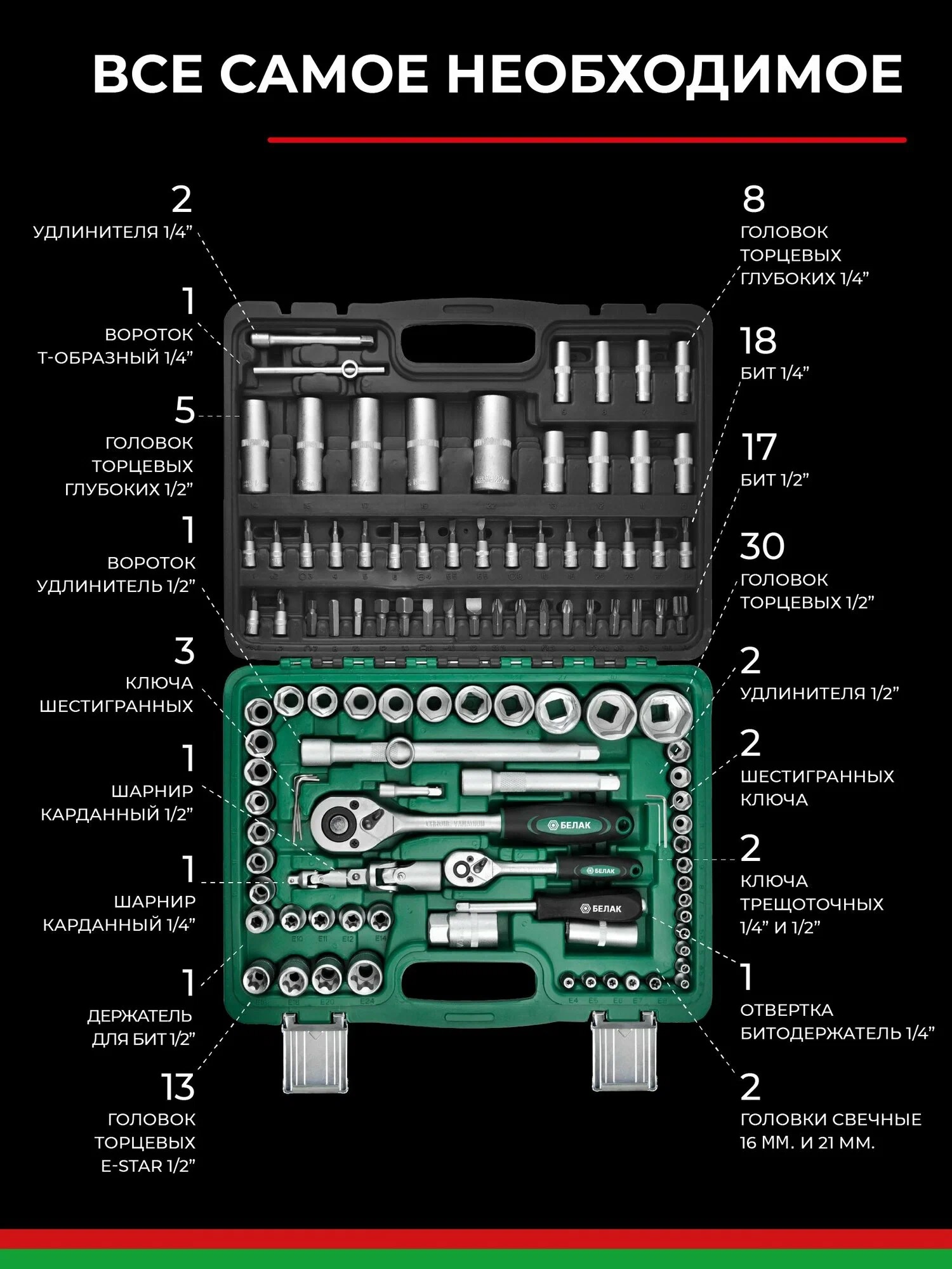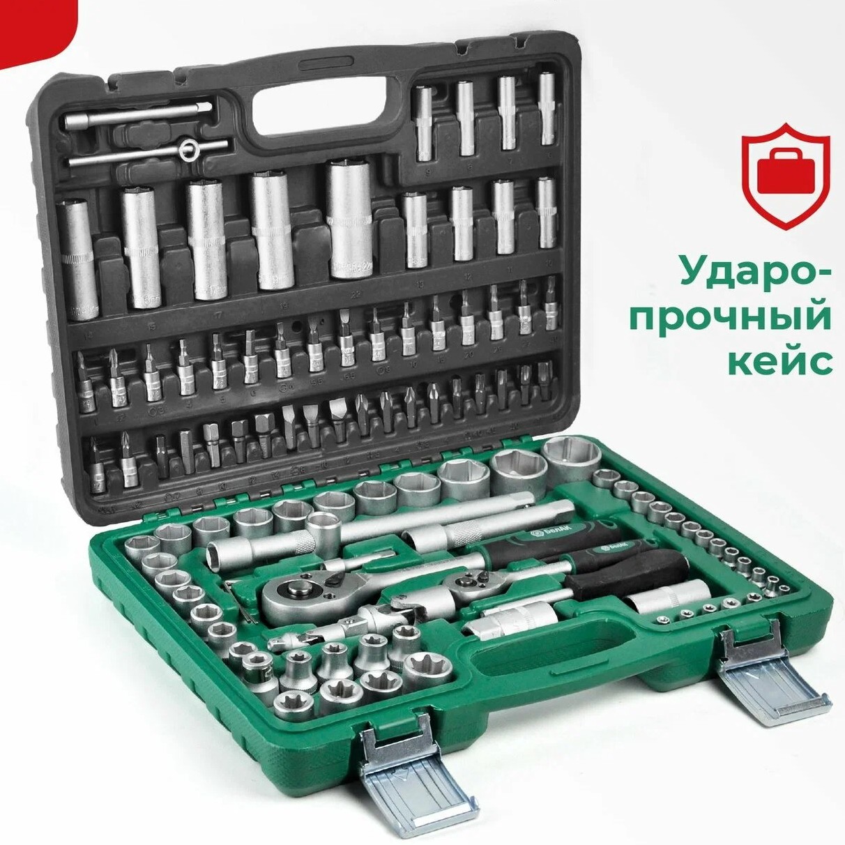 Большой набор ручного инструмента, хороший вариант для автомобилиста и домашнего мастера. В комплект входят 110 предметов, изготовленных из прочной легированной стали. Набор включает трещотки, головки, ключи HEX и TORX, биты и другие необходимые аксессуары. Кейс противоударный, с надёжными замками.