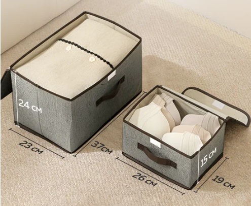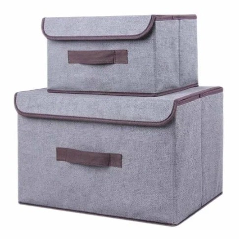 Коробочки из плотного картона с текстильной отделкой, складываются компактно, а в разложенном виде имеют размер 26×19×15 см и 37х23х24 см. Стенки и дно укреплённые, держат форму, содержимое не повреждают. У каждой коробки своя крышка и удобная ручка для переноски. Подойдут для одежды, книг, игрушек или всякой мелочи, чтобы навести порядок на полках.