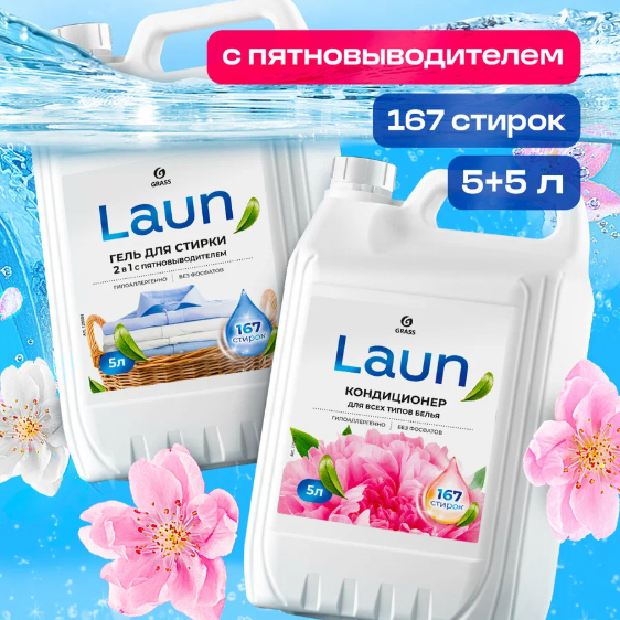 В наборе гипоаллергенный гель для стирки 2 в 1 с пятновыводителем и кондиционер для белья Цветочное вдохновение. Оба средства в удобных канистрах по 5 литров, должно хватить надолго.