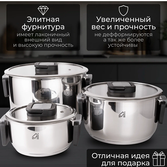 С промокодом как будто топчик) Три кастрюли из пищевой нержавейки объёмом 1.6, 3.6 и 6.7 литра. Стенки 0.6 мм, дно трёхслойное - нагревается равномерно, еда не пригорает. Ручки пластиковые, складные: можно сложить кастрюли одна в одну и убрать подальше, место на кухне экономится. Подходят для любых плит, включая индукцию. Можно мыть в посудомойке. Крышки с отверстиями для пара.