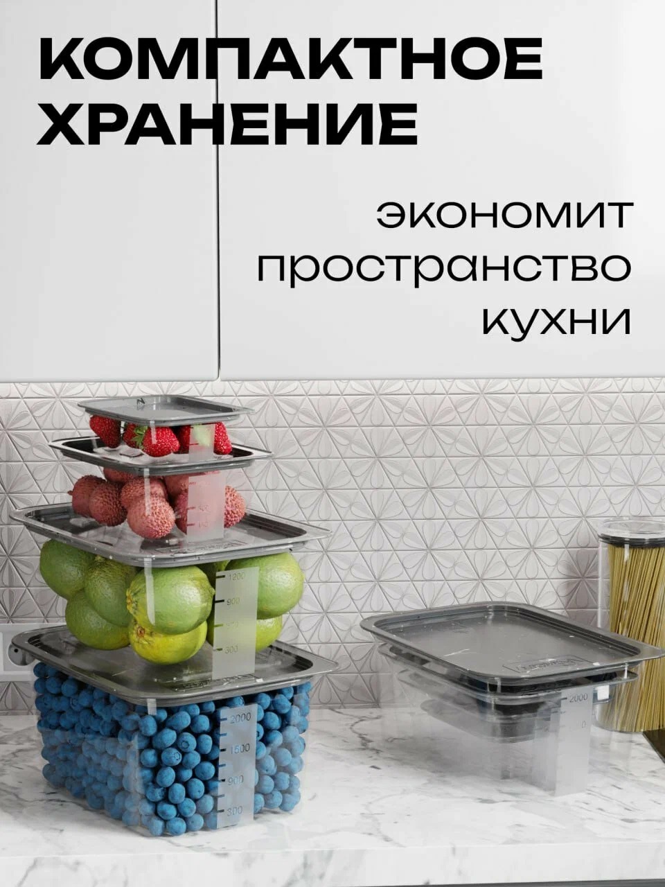 Есть от маленьких для специй до больших для супов и салатов. Все в едином стиле, с прозрачными стенками. Можно греть не открывая. Специальные клапаны по бокам выпускают пар, если ставишь в микроволновку с закрытой крышкой. Качественный полипропилен (РР), без запаха, без бисфенола-А. Можно не переживать, что еда впитает что-то вредное.