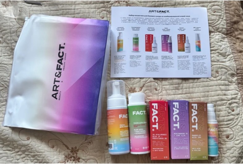 Там внутри аж 6 полноразмерных продуктов, и это не пробники какие‑то, а реально полноценные банки. Всё для комбинированной кожи, как у большинства из нас. Пенка для умывания, тоник, крем, пилинг, сыворотка и солнцезащитка с СПФ 40+.