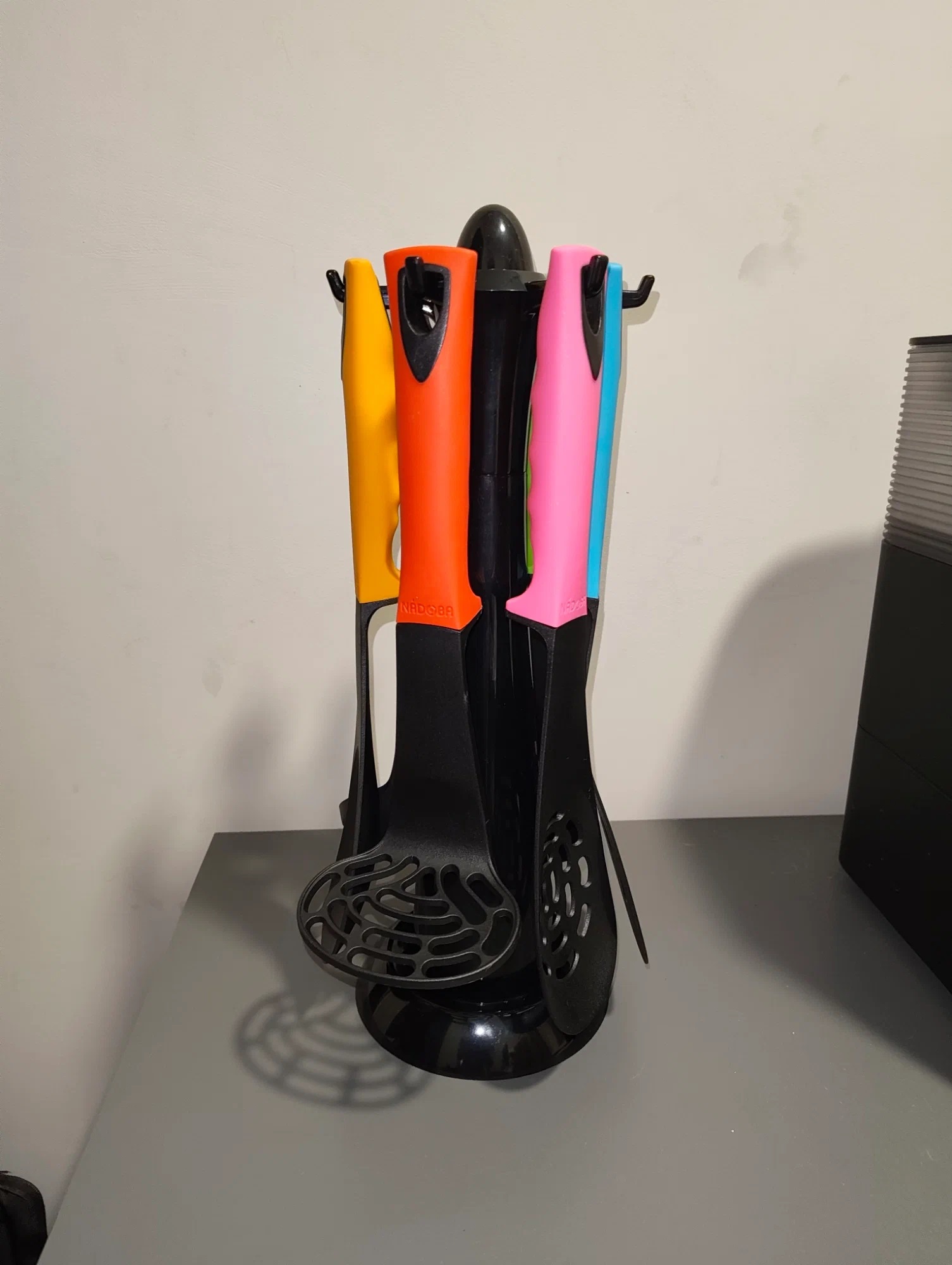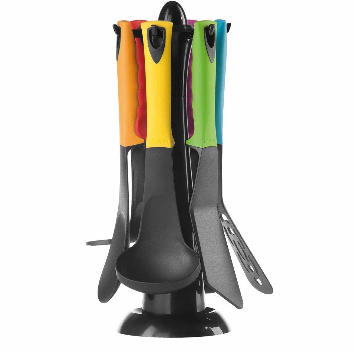 В наборе есть ровно то, чем пользуюсь каждый день: прочные лопатки для жарки, половник с мерной шкалой, шумовка, мерная ложка, мялка картошки и удобные щипцы. Все предметы сделаны из термостойкого силикона и нейлона. Они не царапают антипригарное покрытие. Наборчик очень яркий, для кого то будет минусом, но мне наоборот нравится.