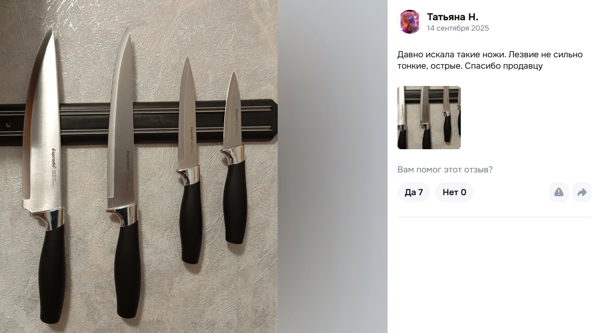 Хотелось найти что-то острое, удобное и без переплаты за громкий бренд. На озон более 1400 отзывов, но на Яндекс сейчас лучшая цена. В наборе есть все основные ножи, которые нужны на кухне каждый день - шеф-нож, для нарезки, универсальный и маленький овощной. У основания лезвия есть пластиковая вставка, ручки приятные на ощупь, не скользят даже в мокрой руке.