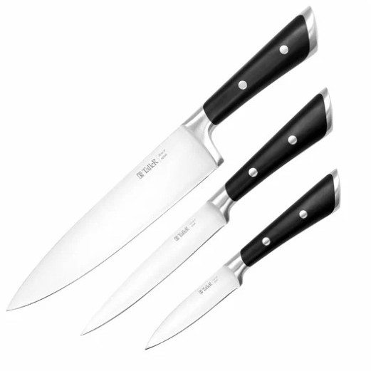 Хороший набор из трёх острых кухонных ножей TalleR из серии Элемент. В комплекте самые ходовые ножи: поварской с лезвием 20 см для мяса, рыбы и крупных овощей, универсальный нож 12,5 см для всего подряд и маленький нож с 9 см лезвием для чистки картошки, фруктов и мелких работ. Лезвия из хорошей стали 3Cr13, ручки из нескользящего пластика. Мыть их лучше руками, а не в посудомойке, так и заточка остаётся острее.