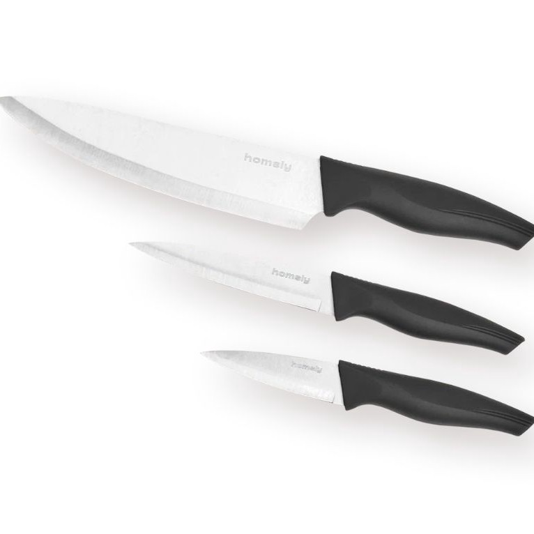 Три штуки за 333₽: шеф-нож 19.5 см, универсальный 12.5 см, нож для овощей 8.5 см.