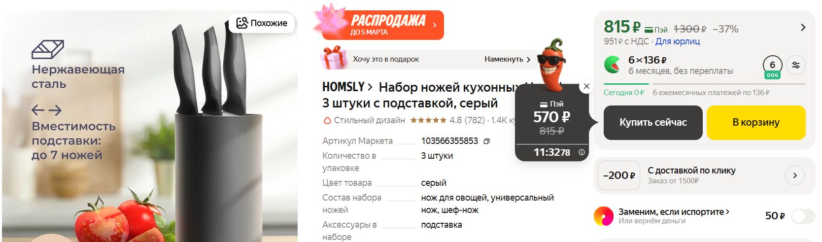 У меня появилась на этот набор акция с перчиком) При оплате картой Пэй можно забрать его всего за 570₽. Все видели эти наборы за 1500-2000₽, которые в итоге тупятся после первого помидора и занимают место в ящике. Знакомое чувство - выкинуть жалко, пользоваться стыдно.