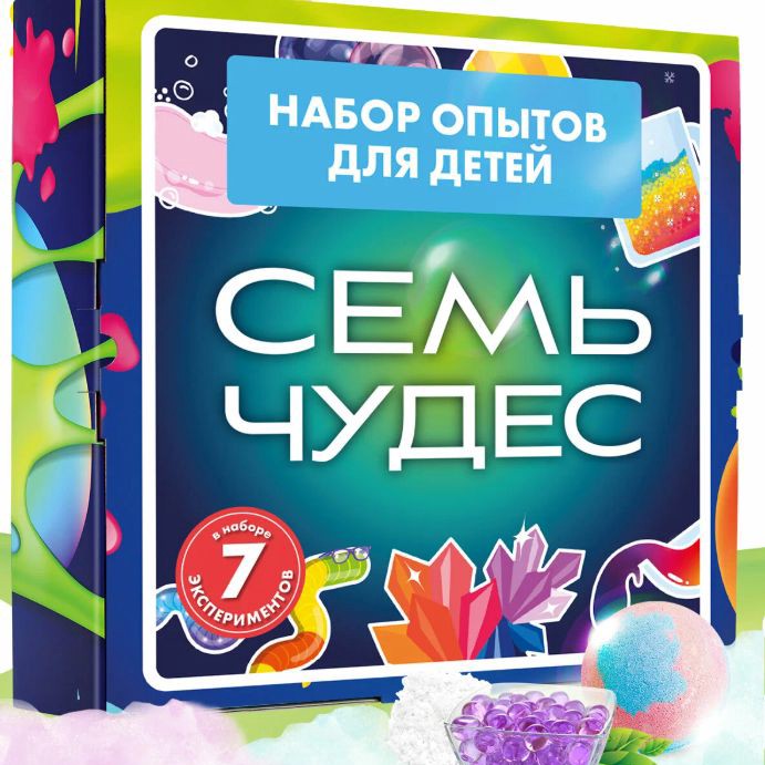 Там всё, чтобы ребёнок визжал от восторга: слайм, мыло, снег искусственный, гидрогель, кристаллы, червяки полимерные и бомбочки для ванны. Целых 7 экспериментов в одной коробке! Серия «Эксклюзив», упаковка подарочная, инструкция понятная - даже я разобралась))