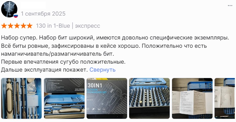 Выбирай экспресс доставку в пункт выдачи! По сути это одна удобная отвёртка и к ней куча всего: биты с разными наконечниками, удлинители, гибкие переходники - можно в любое труднодоступное место подлезть. В общем, 130 штук в одном наборе, под любой винт. Кейс пластиковый, можно выбрать один из трёх цветов, какой больше нравится. Отзывы хорошие и больше 2,5к заказов.