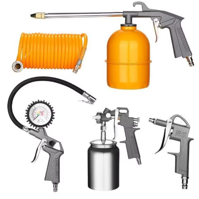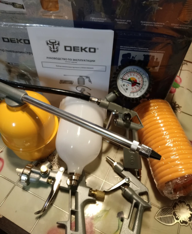 Обычно от 1800₽. Полезный комплект для тех, кто возится с машиной или любит делать ремонт сам. В наборе 5 предметов: краскопульт с верхним бачком (для покраски деталей), пистолет для продувки (сдуть пыль с фильтра или продуть труднодоступные места) и пистолет для подкачки шин, с манометром. Шланг 5 метров - хватит, чтобы не таскать компрессор за собой. Всё с быстросъёмными соединениями, корпуса металлические. Для покраски, продувки и подкачки огонь