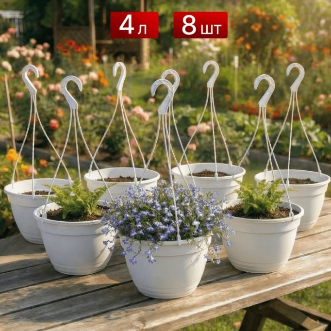 Кашпо на 4 литра, из прочного пластика с защитой от ультрафиолета - не выцветут за сезон. На дне дренажные отверстия, вода не застаивается. Подходят для петуний, фиалок, бальзамина и всего, что любит свисать.