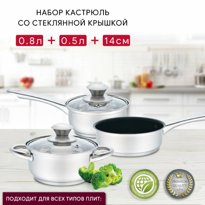 В комплект входит кастрюля 0.8 л, ковш 0.5 л, сковорода с антипригарным покрытием XYLAN 14 см и две крышки 14 см с пароотводом. Вся посуда устойчива к механическим воздействиям и совместима со всеми типами плит.