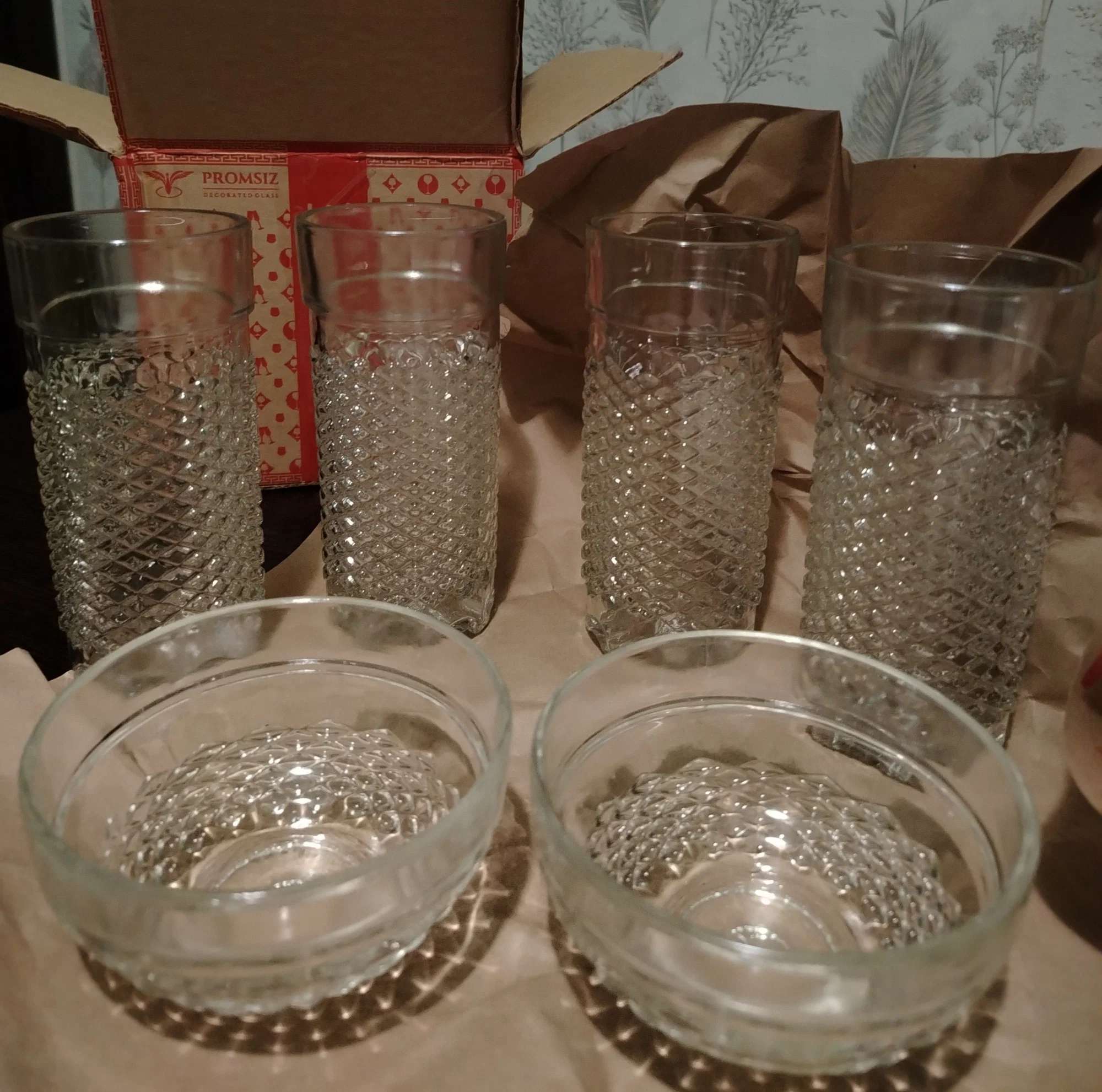 За такой набор - цена более чем низкая! Судя по отзывам, пользуется популярностью. В наборе 4 высоких стакана объёмом 450 мл и 2 небольших салатника объёмом 350 мл. Из прозрачного стекла с рельефным декором.