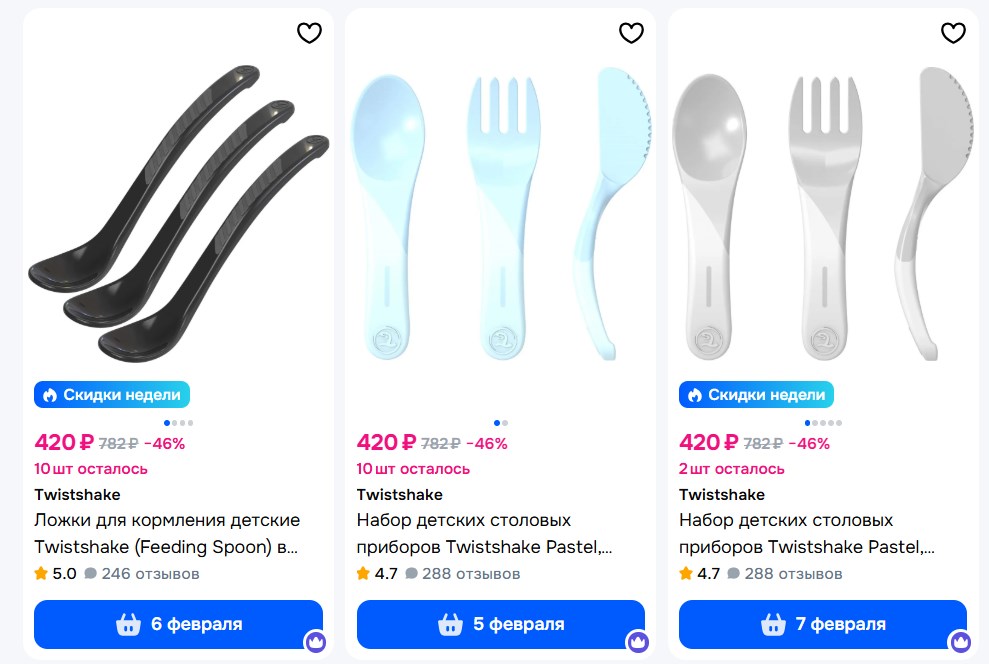 У меня сейчас малыш на прикорме. На Маркете нашла ложки и вилки от Twistshake по 76₽ - пару наборов взяла.