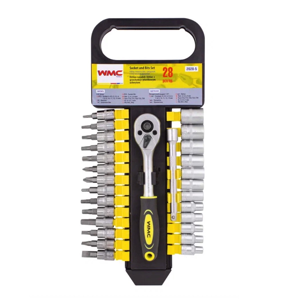 Это 28 предметов в одном футляре: и головки торцевые, и биты. Всё с посадочным 1/4 дюйма. Головки там с 4 по 13 мм - самые ходовые размеры, прям на все случаи. Плюс трещотка удобная, зубчиков много, так что в тесных местах типа под капотом или за шкафом её нормально юзать.