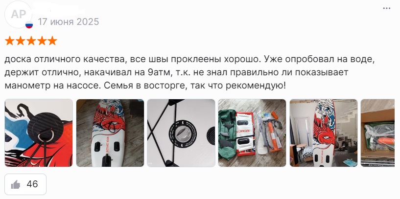 Классная цена на надувную доску от проверенного бренда с быстрой доставкой! Это полный комплект для сапсёрфинга: сама доска, весло, насос, лиш (страховочный поводок на ногу), плавники, нескользящий коврик и даже чехол для смартфона. В карточке товара на выбор несколько расцветок. А в комментариях много фоток и отзывов с обзорами.