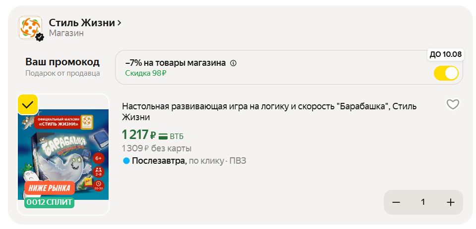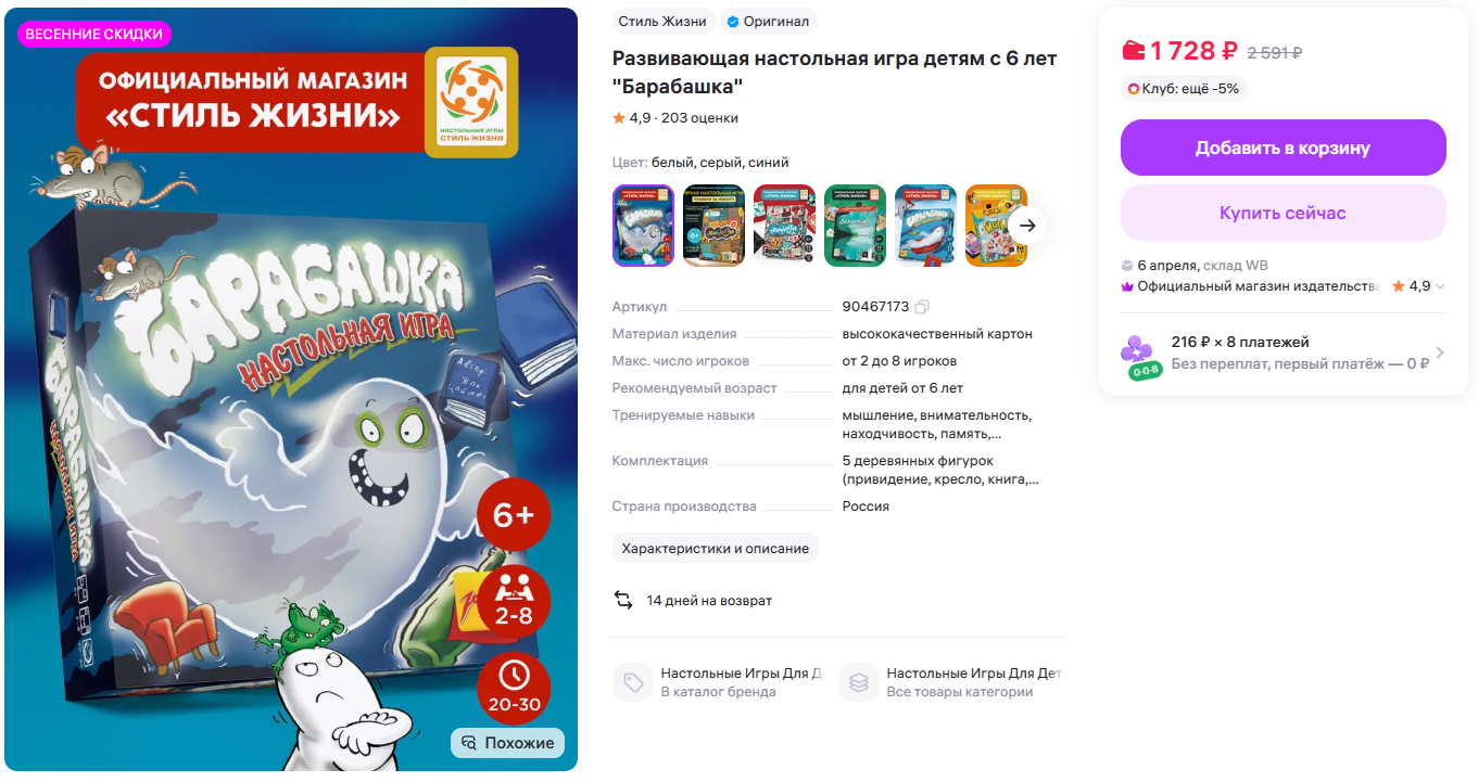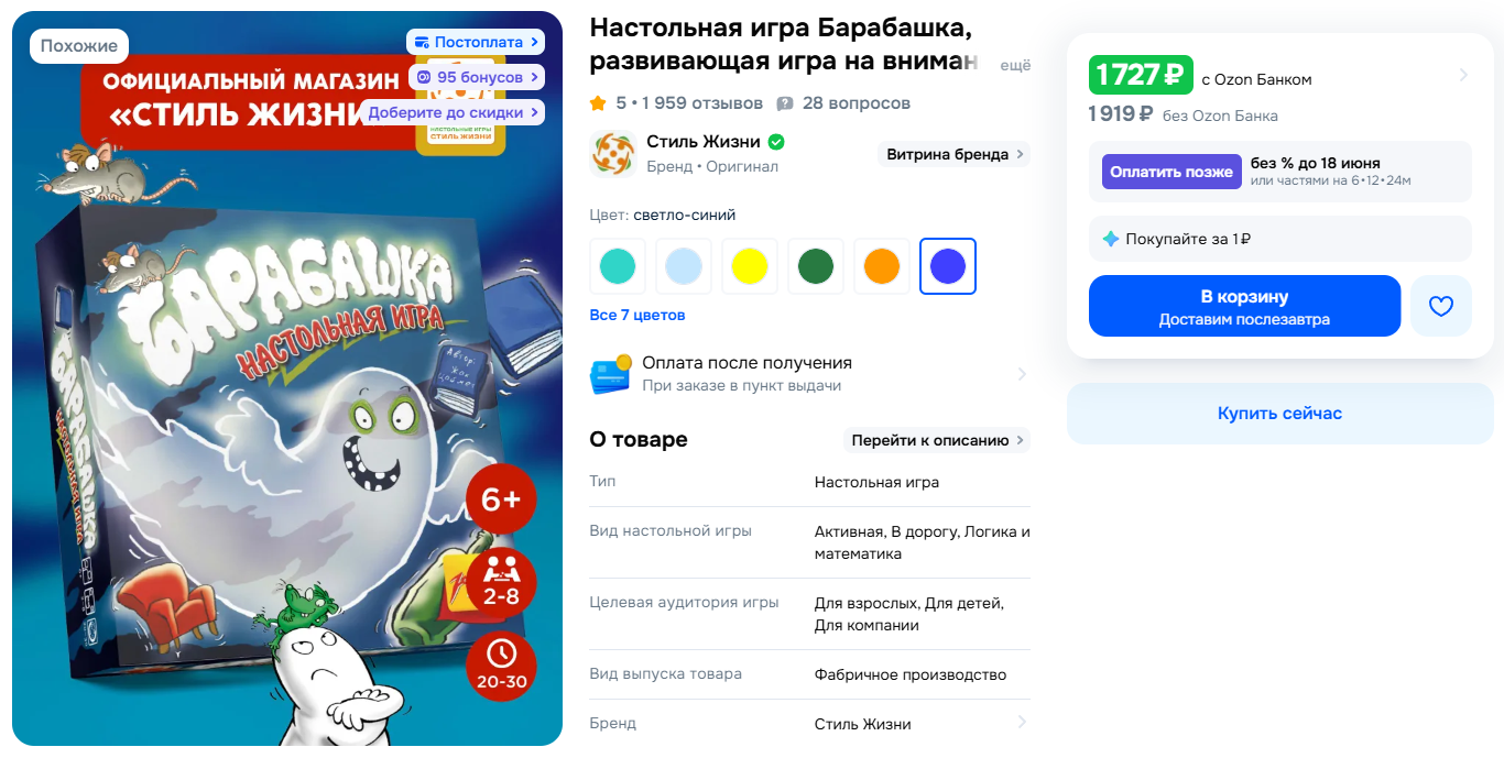 Увидел, что сейчас на настолку Барабашка действует дополнительная скидка 7%, выходит 1217 рублей. А на Ozon и Wb такая от 1727 р.