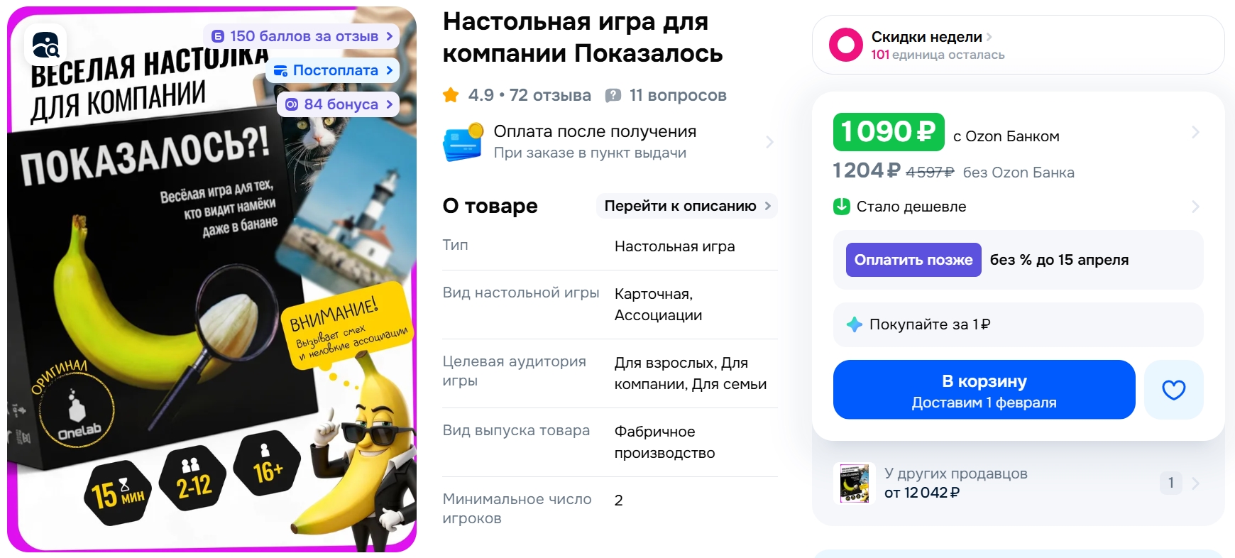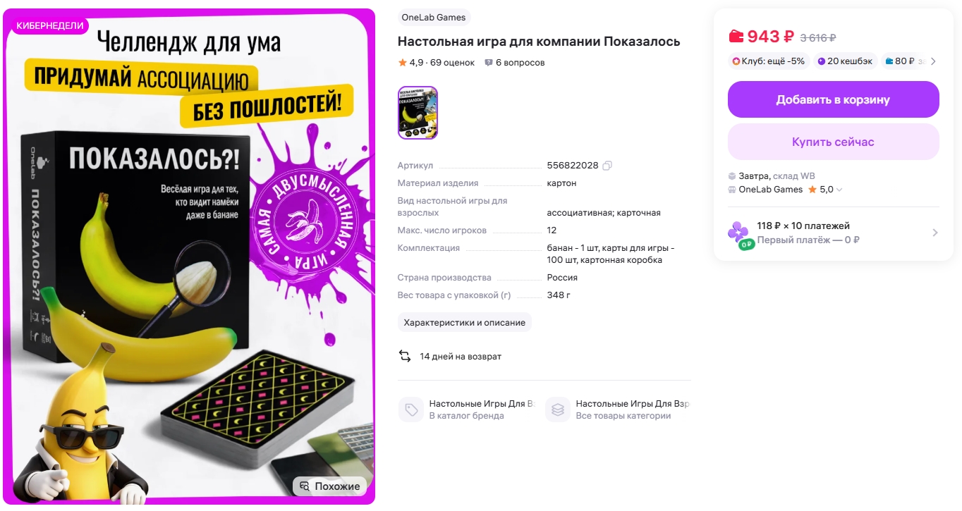 Находка для тех, кому надоели сложные настолки. Искала что-то простое и весёлое для посиделок без долгого изучения правил. Эта игра идеально подошла: открыл коробку, раздал карты и уже смеёшься над абсурдными ассоциациями. Банан в наборе - отдельный восторг 🍌