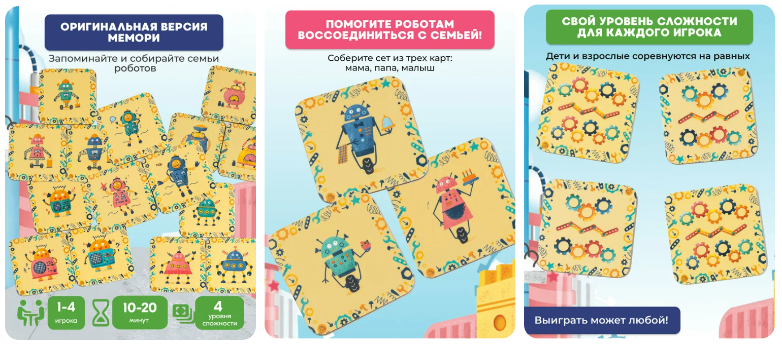 Это развивающая игра-головоломка, где нужно искать не просто одинаковые карточки, а целые семьи роботов. Формат чуть сложнее классических «парочек», поэтому игра лучше тренирует память, внимание и логику, но при этом остаётся понятной даже для малышей.
