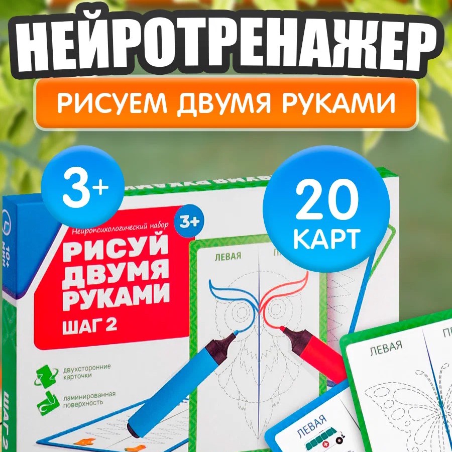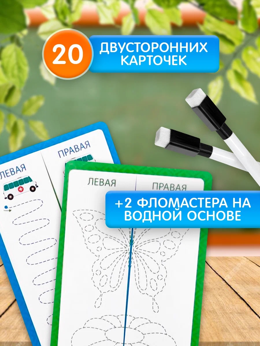 Набор помогает развивать межполушарные связи, тренирует координацию, внимание и пространственное мышление. В наборе идут 20 двухсторонних карточек 2 маркера. Карточки много разовые, рисунки стираются салфеткой или обратной стороной маркера.