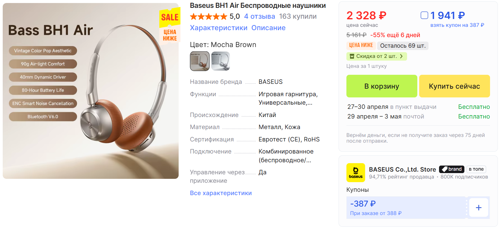 В официальном магазине Baseus на AliExpress сейчас можно присмотреть беспроводные наушники на любой вкус: полноразмерные, внутриканальные, спортивные, с шумоподавлением и без. Вот несколько моделей по хорошим ценам: