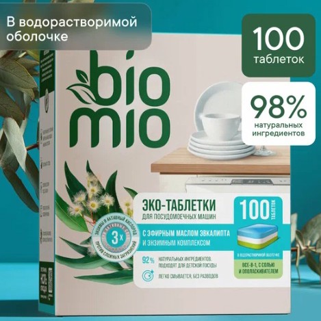 В упаковке 100 таблеток для посудомойки BioMio с эвкалиптом, выходит 10 рублей за штучку. Состав биоразлагаемый, с натуральным эфирным маслом, пахнет приятно и без химии. В таблетке уже есть и моющее, и соль, и ополаскиватель, так что ничего дополнительно сыпать не надо. Оболочка водорастворимая - кидаешь прямо так, разворачивать не нужно.