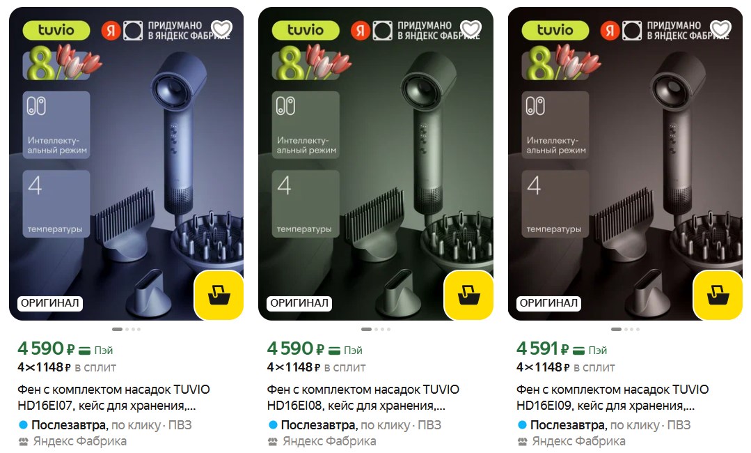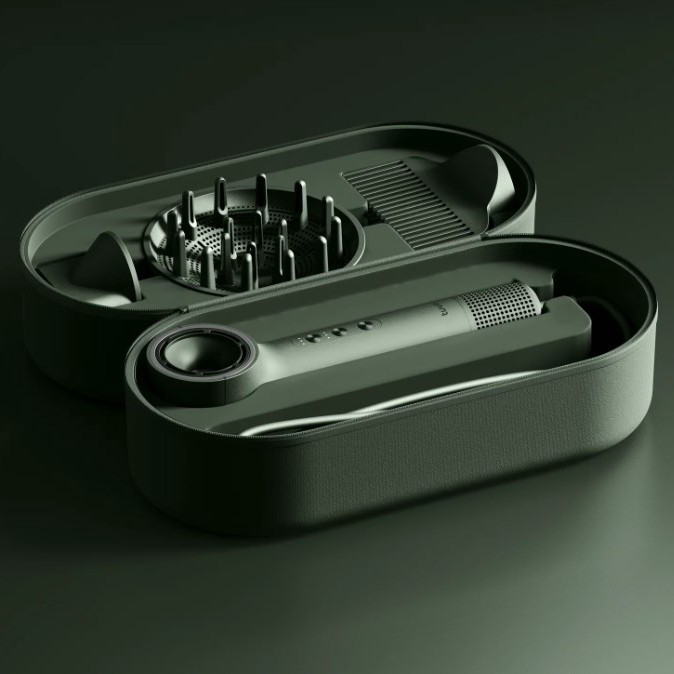 С BLDC-мотором (110 000 об/мин), 4 температуры, ионизация, чередование горячего/холодного. В комплекте магнитные насадки: концентратор, расчёска, диффузор + кейс для хранения. Мощность 1500 Вт, шнур 2 м.
