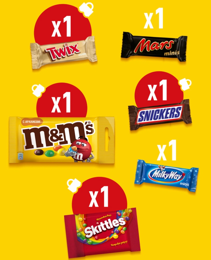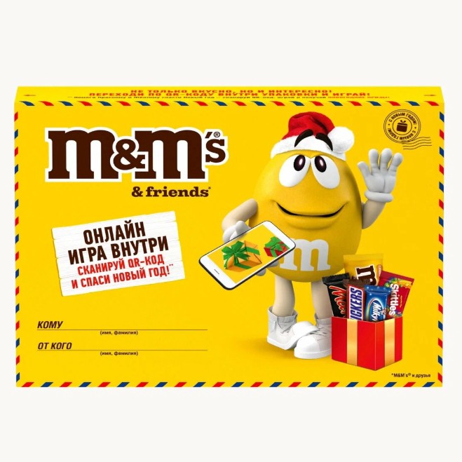 Внутри ассорти из M&M’s, Skittles и мини-батончиков Snickers, Mars и Milky Way, плюс небольшая онлайн-игра по QR-коду.