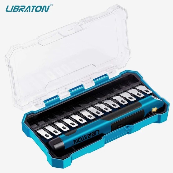В наборе рукоятка, у которой есть подсветка рабочей зоны - это удобно, если света мало или в надо точечно подсветить предмет. Лезвий 13 штук, все разной формы, под любую задачу: где-то подрезать, где-то потоньше, где-то покривее. Всё это хранится в пластиковом кейсе, не растеряется. Минимальный заказ через комбо-корзину тысяча рублей, но зато доставка ускоренная, добрать можно из каталога.