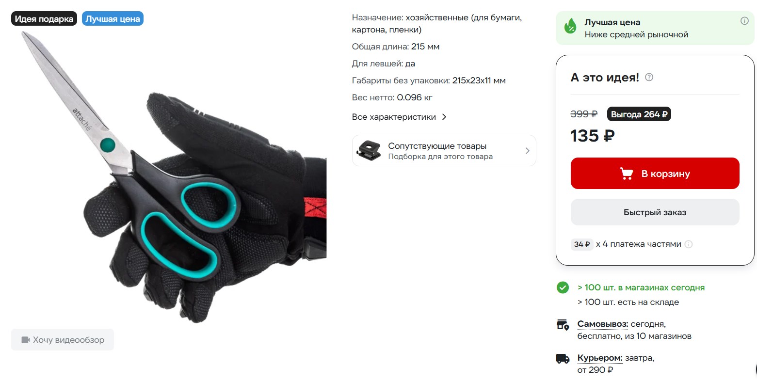 Нашла отличные ножницы Attache за 135₽ на ВсеИнструменты. Длина 215 мм - универсальный размер для дома или офиса, подходят для бумаги, картона, плёнки. У них трёхсторонняя заточка, так что режут остро и аккуратно.
