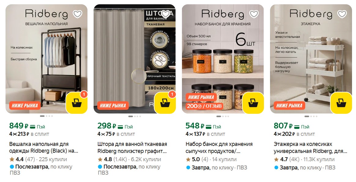На Яндекс Маркет есть базовые товары для обустройства дома по вполне доступным ценам от бренда Ridberg.