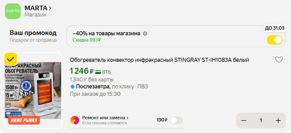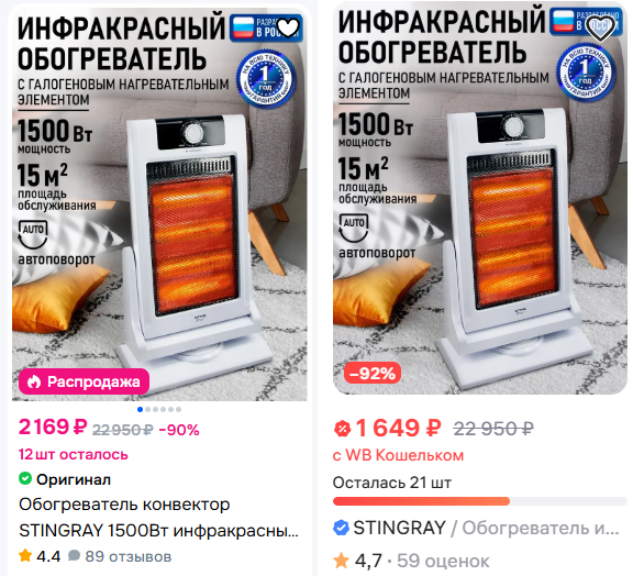 Сейчас можно взять инфракрасный напольный обогреватель с дополнительной скидкой 40% за 1246 рублей, если платить картой ВТБ. На других маркетплейсах такой от 1649 рублей.