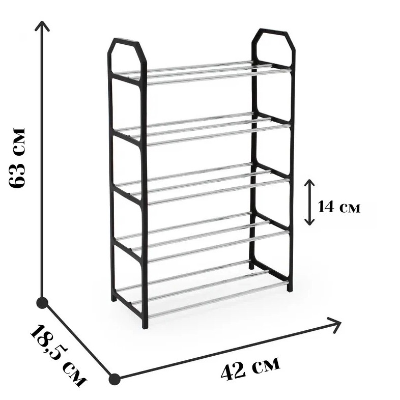 Компактная металлическая обувница на 5 ярусов вмещает до 10 пар обуви. Подойдёт для прихожей или гардеробной