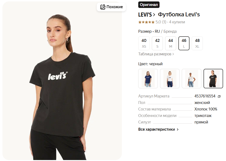 Футболка Levi's женская - базовая модель размеров 40-48 по цене 1109₽ + к покупке начисляется 200 баллов Яндекс Плюса за отзыв