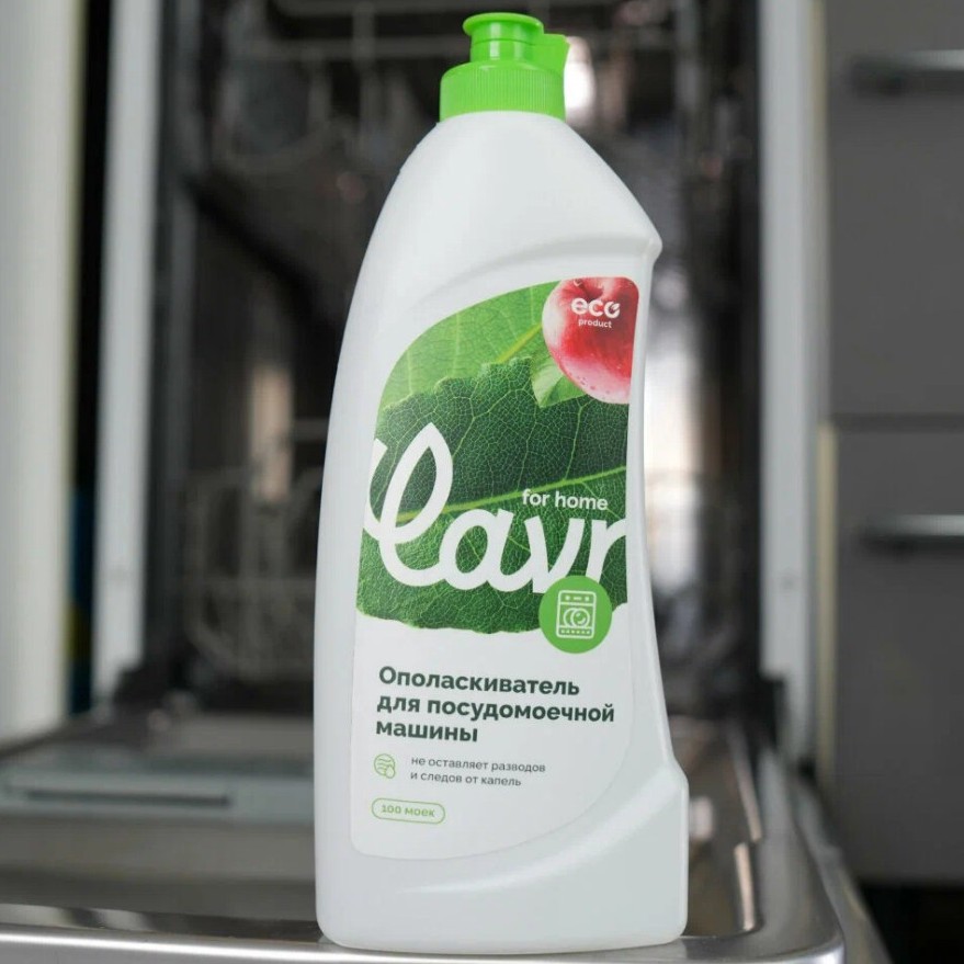 Средство добавляют в посудомоечную машину, чтобы убрать остатки моющего и избежать разводов на стекле, пластике и металле. После мойки посуда выходит более чистой и без мутной плёнки. Формула биоразлагаемая, без фосфатов, хлора и аммиака. Запах лёгкий, расход небольшой, поэтому одной бутылки обычно хватает надолго.