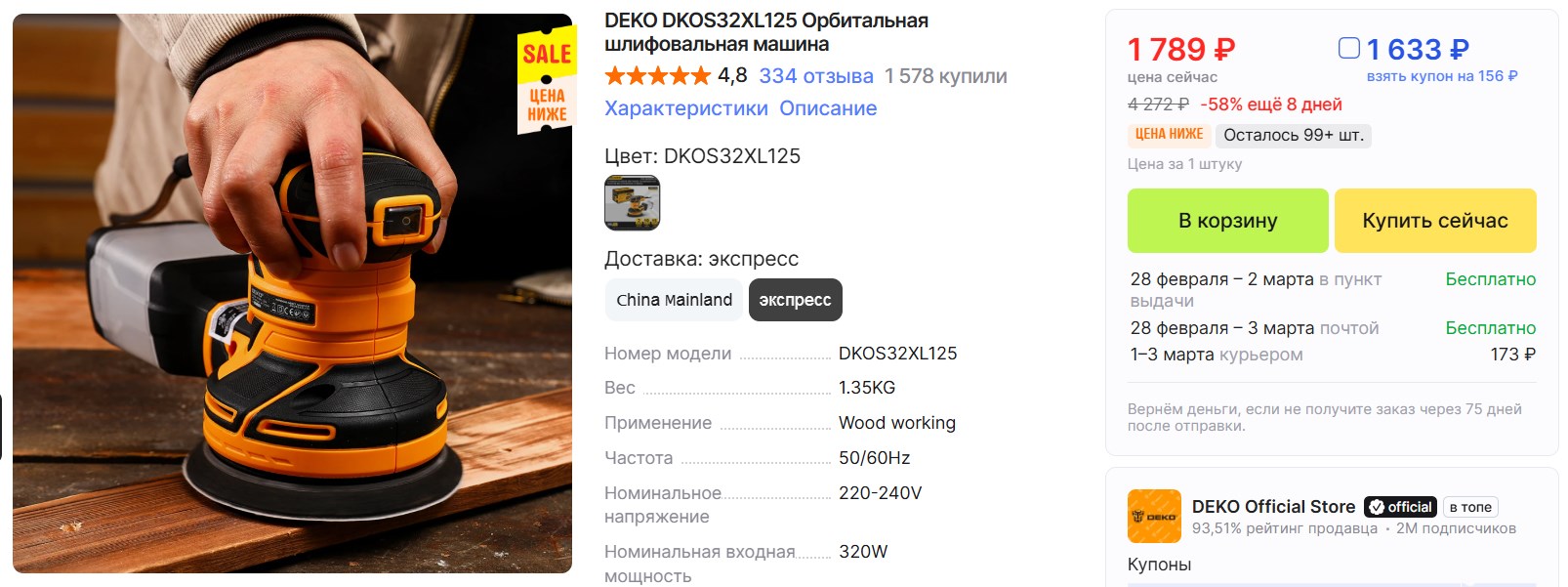 Привет. На Алике орбитальная шлифмашина DEKO за 1633₽ - с купоном продавца и быстрой доставкой. Мощность 320 Вт, регулировка оборотов от 7 до 14 тысяч, посадочный 125 мм (стандартный). Вес 1,35 кг, так что рука не устанет.
