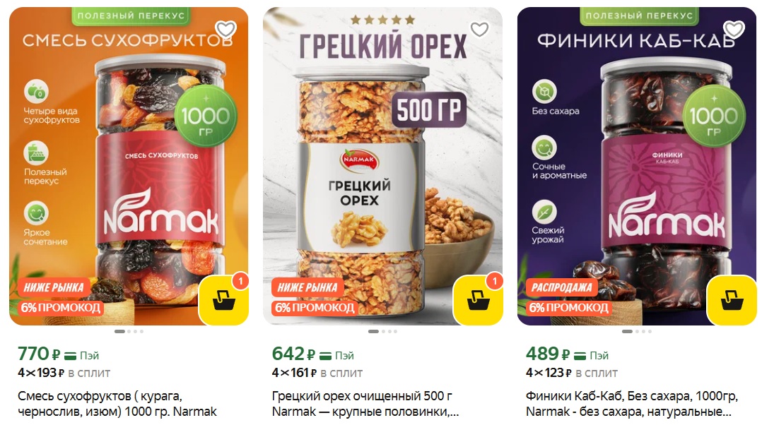 Полезные перекусы NARMAK по хорошим ценам, в других маркетплейсах и магазинах цены выше. Продукты качественные, ядра орехов крупные, цельные, сухофрукты чистые, ароматные.