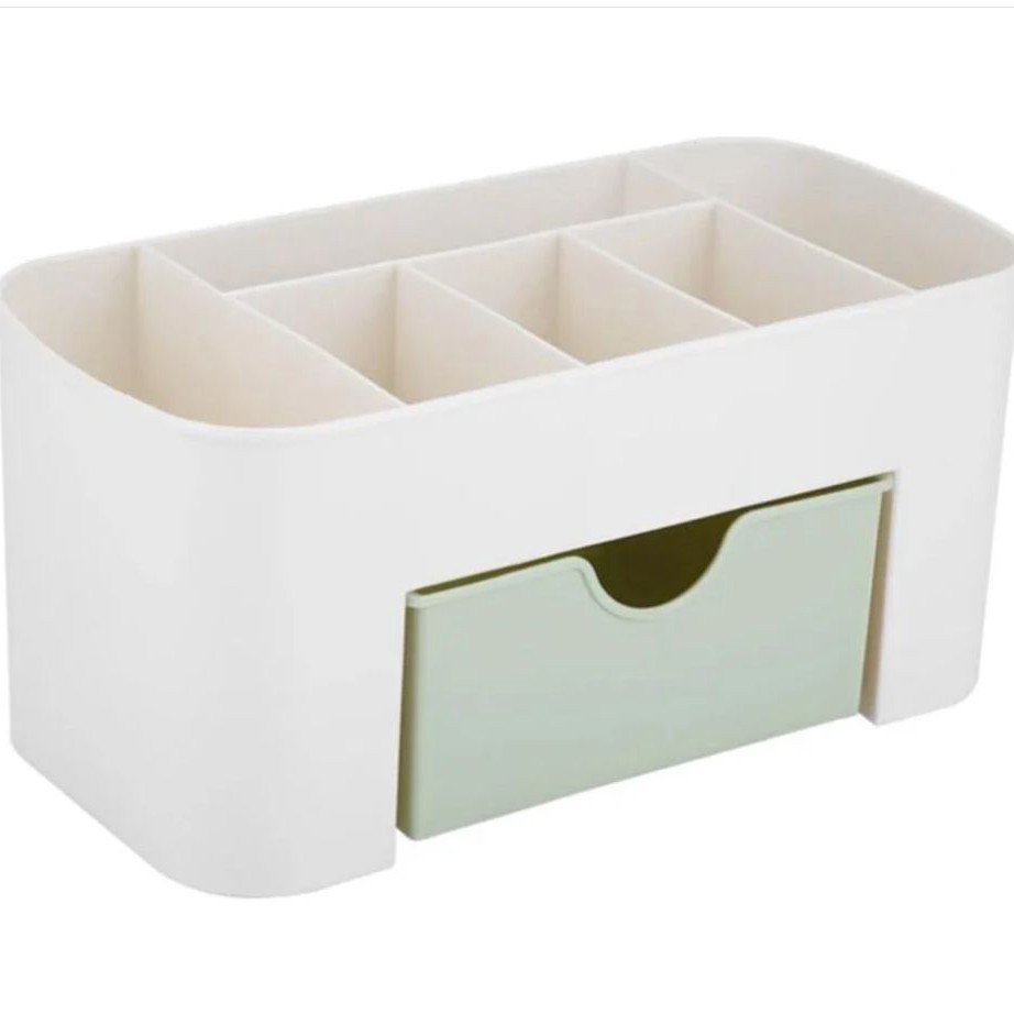 Из хорошего пластика, 7 отсеков. Для косметики, кистей, украшений, канцелярии или инструментов - всё влезет. На стол поставить, в ванную или для рукоделия.